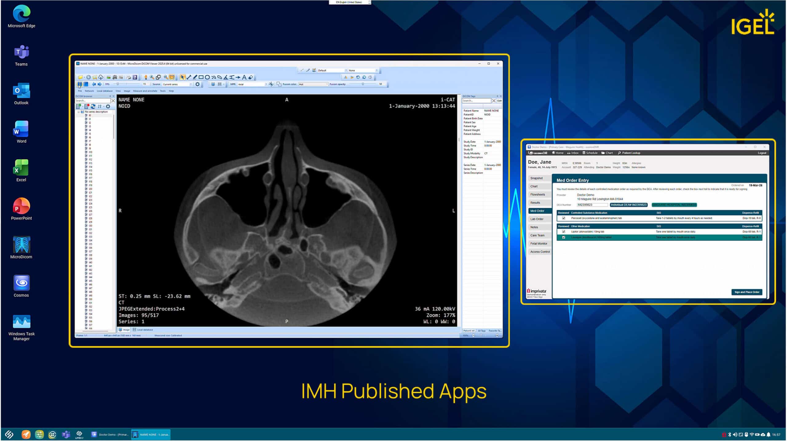 IMH Published Apps are an exciting new delivery model based upon the IGEL Managed Hypervisor™ to provide Windows apps that seamlessly integrate within IGEL OS and run locally on the endpoint device. The result is a secure, integrated experience for many kinds of apps and use cases – a clinician working with medical imaging software, a designer creating blueprints in a specialized visualization solution, or a developer working on .NET apps and scripts.